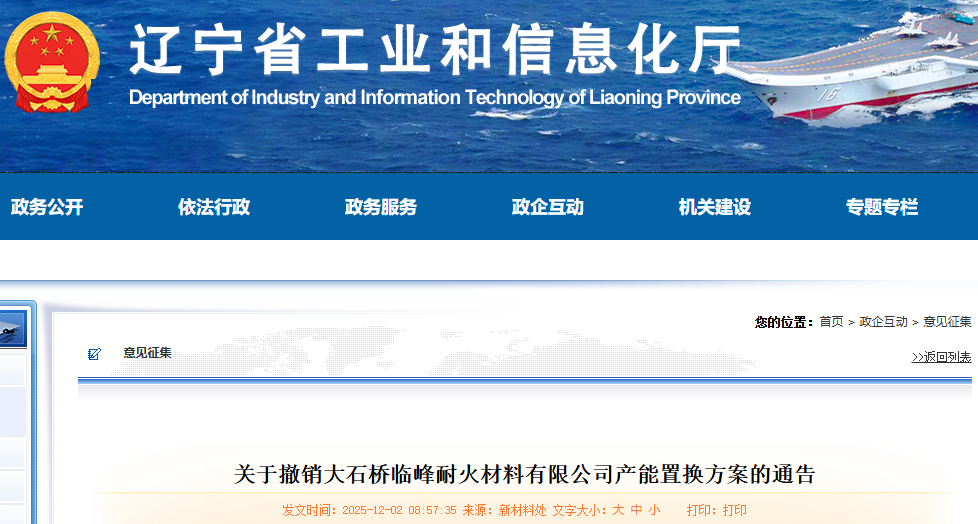 2025年10月10日,我廳對大石橋臨峰耐火材料有限公司新建輕燒氧化鎂項目產(chǎn)能置換方案進行了通告。因市場供需發(fā)生變化等原因,企業(yè)決定終止相關(guān)項目的建設(shè)。經(jīng)企業(yè)和營口市工信局申請,現(xiàn)將《關(guān)于營口關(guān)山耐火材料有限公司等企業(yè)新建輕燒氧化鎂項目產(chǎn)能置換方案的通告》中大石橋臨峰耐火材料有限公司年產(chǎn)10萬噸輕燒氧化鎂產(chǎn)品塔式組合自動化環(huán)保豎窯及配套生產(chǎn)線建設(shè)項目產(chǎn)能置換方案予以撤銷。