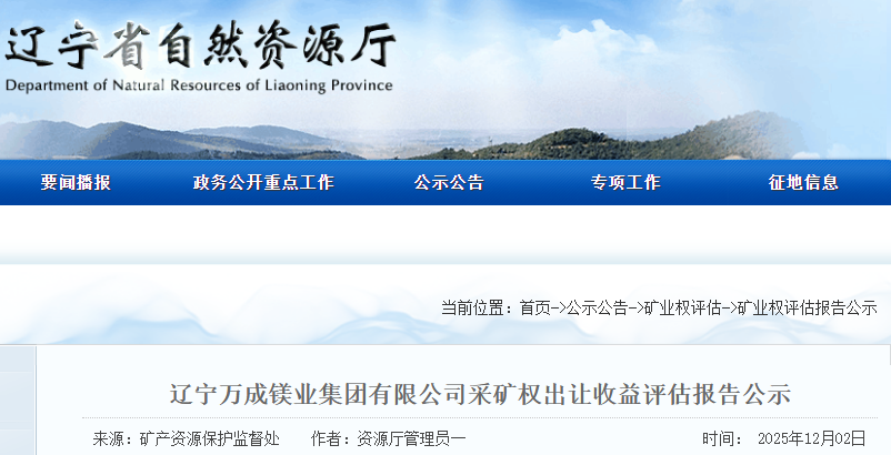 遼寧萬成鎂業(yè)集團有限公司采礦權出讓收益評估報告通過遼寧省自然資源廳門戶網站向社會公示,公示10個工作日。如有異議,請于公示之日起10個工作日內以電話方式先向省自然資源廳礦產資源保護監(jiān)督處提出簡要意見,隨后及時將書面意見反饋到省自然資源廳礦產資源保護監(jiān)督處。
