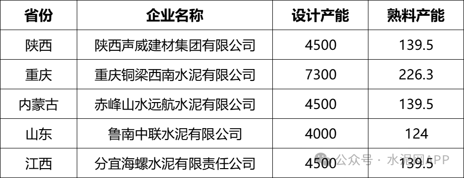 表:2025年5條熟料生產(chǎn)線投產(chǎn)信息
