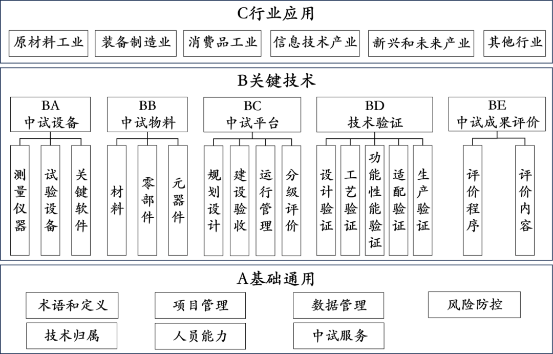 制造業(yè)中試標(biāo)準(zhǔn)體系結(jié)構(gòu)包括基礎(chǔ)通用、關(guān)鍵技術(shù)、行業(yè)應(yīng)用等3個部分,如圖1所示。其中,基礎(chǔ)通用標(biāo)準(zhǔn)規(guī)范制造業(yè)中試的通用性技術(shù)和要求,是制造業(yè)中試標(biāo)準(zhǔn)體系的底層支撐。關(guān)鍵技術(shù)標(biāo)準(zhǔn)規(guī)范制造業(yè)中試設(shè)備、物料、平臺、驗證、成果評價等要求,是制造業(yè)中試標(biāo)準(zhǔn)體系的核心內(nèi)容。行業(yè)應(yīng)用標(biāo)準(zhǔn)規(guī)范各行業(yè)中試的應(yīng)用要求,確保中試活動在具體行業(yè)規(guī)范科學(xué)開展,是制造業(yè)中試標(biāo)準(zhǔn)體系的應(yīng)用拓展。
